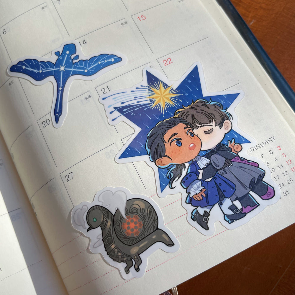 Two sets of matte stickers featuring Raziol and Sulvain from Novae, plus cute little props!...