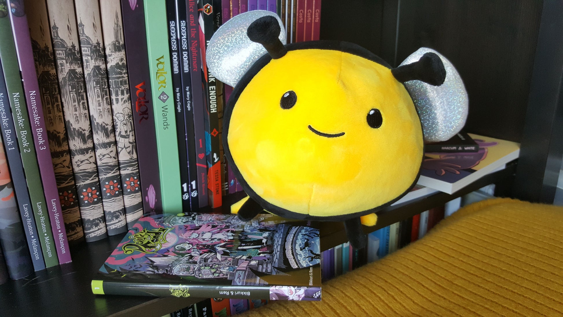 The big bright-eyed bee is named Beets and is 7.5 inches tall, 6.5 inches wide.